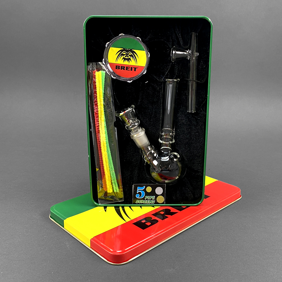 Mit dem Mini Glasbong Set aus dem Hause Breit kommt der ideale Wegbegleiter in allen Lebenslagen, insbesondere wenn du Bock auf 1A Rauchgenuss für unterwegs hast. Optisch und Inhaltlich der absolute Kracher! Das Ganze kommt in einer super geilen Rastabox im typischen grün-gelb-rot mit einem Tiki Tribal Emblem. Alleine diese Box ist schon ihr Geld wert! Perfekt für den Transport deiner Lieblingsutensilien.