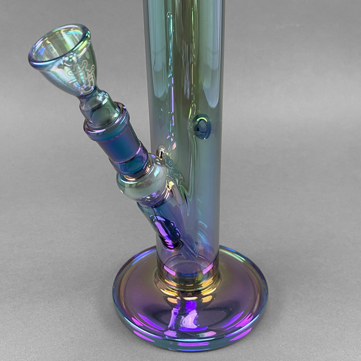 Achtung, Bong ist von außen speziell bedampft um den schimmernden Farbeffekt zu erhalten. Vorsicht mit spitzen/scharfen Gegenständen außen an der Bong und keinen chemischen Reiniger außen anwenden, die Bong ist NICHT säureresistent und abriebfest!