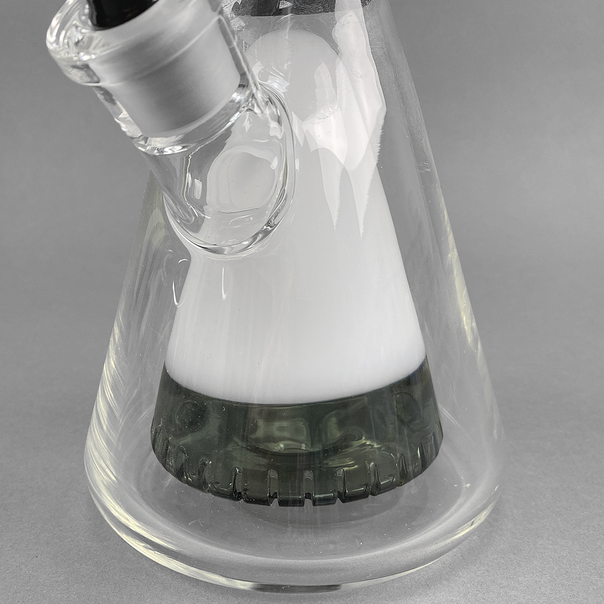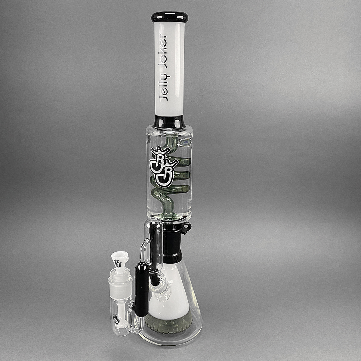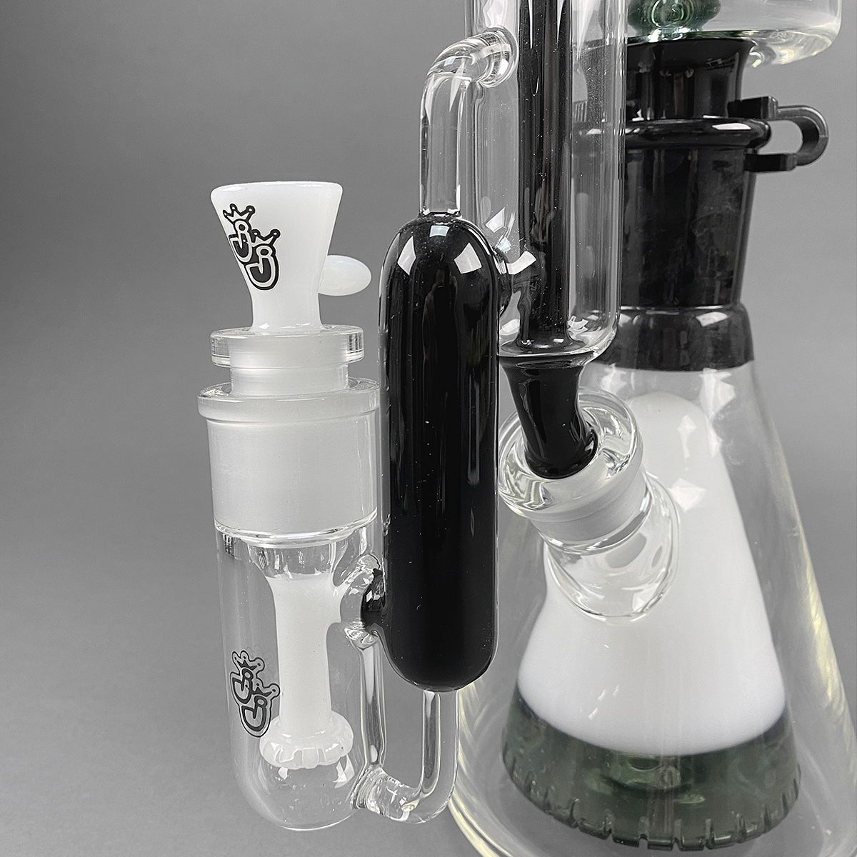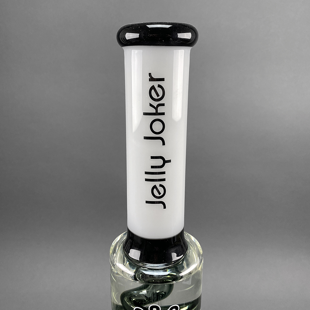 Unten im Bauch befindet sich dann ein leistungstarker Immersion Percolator, ein echter Verwirbelungskünstler, der eng am Glas anliegend fast die gesamte Bowl ausfüllt. Weiterhin wird am Bauch eine weitere Kühleinheit angesteckt, dabei handelt es sich um ein Zwei-Kammer-Vorkühlersystem, ausgestattet mit langen und wirkungsvollen Rauchwegen. In der Ersten der beiden Kammern verrichtet ein durchzugsstarker 29,2er Schlitzdiffusor sein Werk und sorgt für zusätzlich Milde beim Rauchen. Abgerundet wird das Ganze dann mit einem weiß durchgefärbten 18,8er Jelly Joker Trichterkopf.