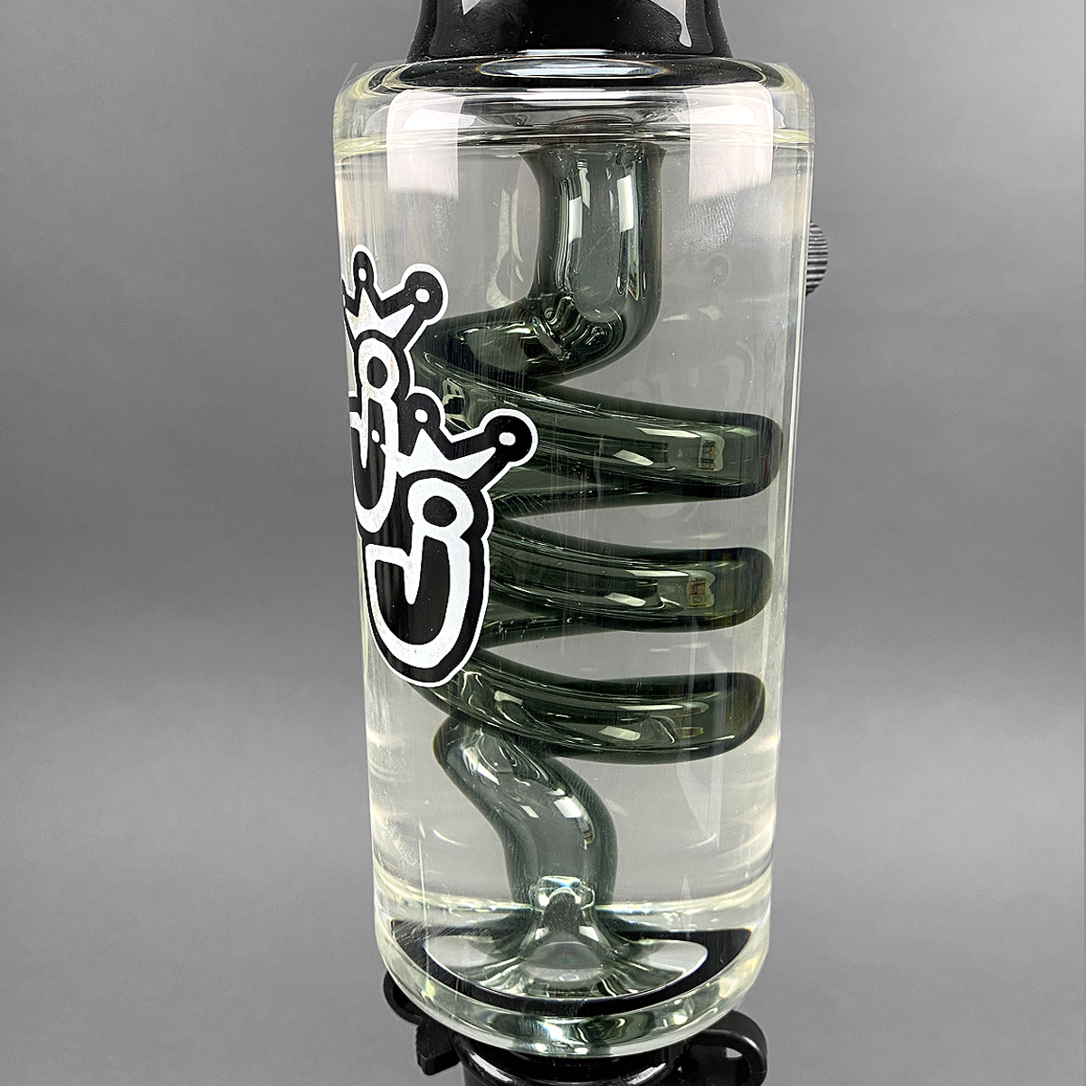 Das seperate, aufsteckbare Oberteil besteht aus einem geraden Zugrohr welches auf dem massiven mit Kühlgel gefülltem 17 x 9 cm Glaszylinder sitzt, in dem eine Rauchspirale verbaut ist. Man kann das Teil vorm Rauchen eine Weile in den Kühlschrank (nicht ins Eisfach!!!) legen und erhält dadurch einen weichen und milden Rauch beim Smoken. Gesichert wird das Ganze mit einer Schliffklammer am Unterteil.