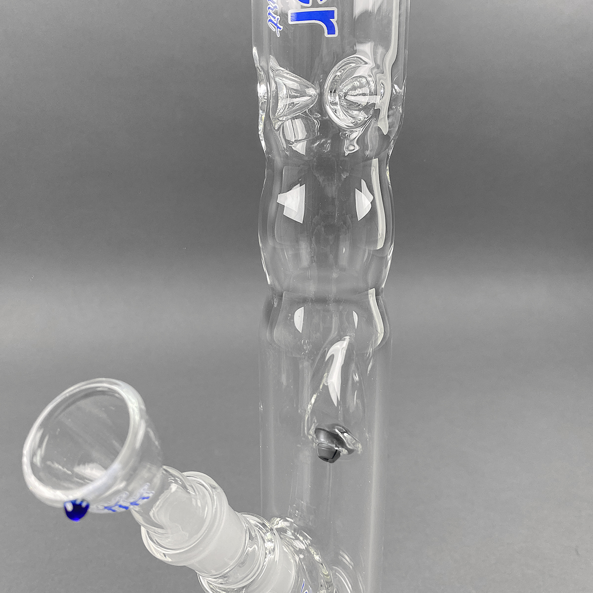 Das gewellte Zugrohr dieser Bong ist nicht nur ein stilvolles Designelement, sondern sorgt auch für ein angenehmes Raucherlebnis. Ausgestattet mit Eiskerben, kannst du ganz einfach Eiswürfel hinzufügen, um den Rauch zu kühlen und die Züge besonders sanft zu gestalten. Das Kickloch mit Stopfen ermöglicht dir individuelle Kontrolle über deinen Zug, sodass du das Rauchen ganz nach deinen Vorlieben anpassen kannst. Zudem ist die „Lasurit“ mit einem Schlitz-Diffusor mit einer Länge von 11 cm ausgestattet, der für eine optimale Filtration und Kühlung des Rauches sorgt. Die zwei 18,8 mm Präzisionsschliffe gewährleisten, dass alles passgenau sitzt und die Bong maximal leistungsfähig ist.