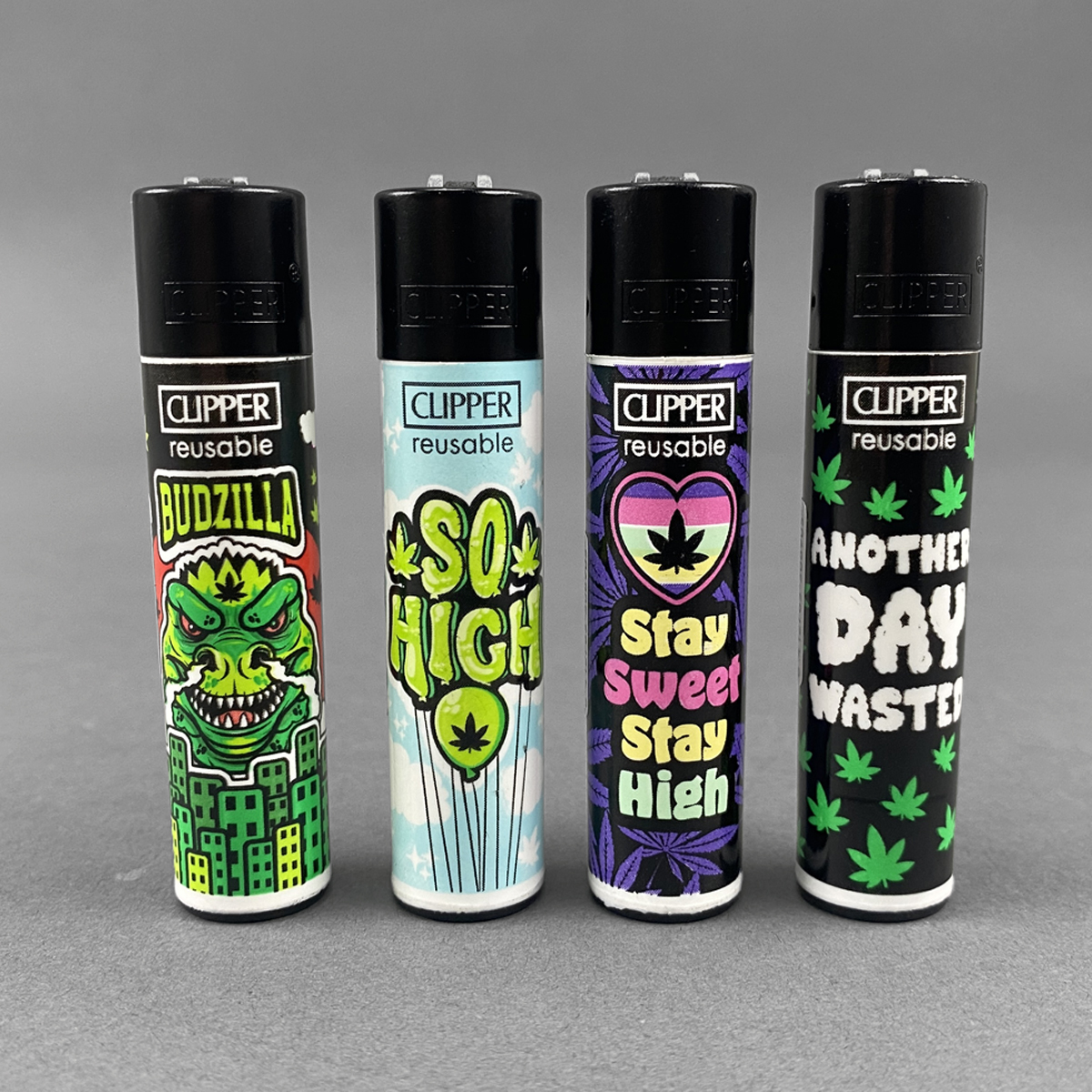Stell dir vor: Es ist ein lauer Sommerabend, du sitzt mit Freunden im Freien und genießt das Leben. Und genau dann kommt das CLIPPER® 420 Mix #11 ins Spiel – dein stylisches Feuerzeug im angesagten Design! Mit seinen vier einzigartigen Motiven, darunter der freche "Budzilla", das lässige "So high", das motivierende "Stay Sweet, Stay High" und das entspannte "Another Day Wasted", wird es zum perfekten Accessoire für deinen Sommerlook.