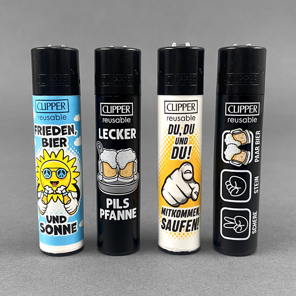 Das Clipper® Bier Slogan #2 Feuerzeug ist nicht nur ein praktisches Werkzeug, sondern auch dein neuer bester Freund, wenn es darum geht, die gute Laune bei jeder Gelegenheit aufzugreifen! Im coolen 4er-Set kommt dieses Feuerzeug mit den frechen Sprüchen „FRIEDEN, BIER UND SONNE“, „LECKER PILS PFANNE“, „DU, DU UND DU! MITKOMMEN, SAUFEN!“ und „SCHERE STEIN PAAR BIER“ daher. Diese humorvollen Designs machen jede Bierpause zu einem kleinen Fest und bringen deine Freunde garantiert zum Schmunzeln, egal ob beim Grillen, Feiern oder einfach nur beim Entspannen im Park.