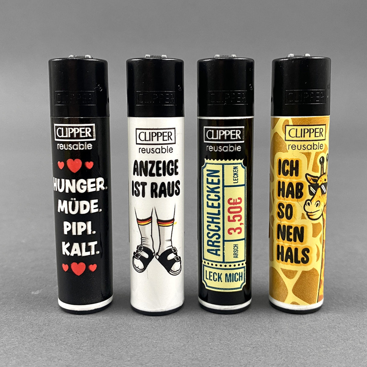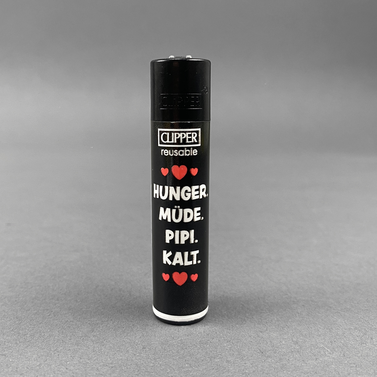 Mach dich bereit für eine explosive Kombination aus Style und Funktionalität mit dem CLIPPER® Sprüche #3! Diese Feuerzeuge sind nicht nur praktische Begleiter, sie sind auch echte Hingucker mit ihren frechen Sprüchen wie "Hunger. Müde. Pipi. Kalt.", "Anzeige Ist Raus", "Arschlecken" und "Ich Hab So Nen Hals". Egal, ob du beim Grillen mit Freunden bist oder einfach nur einen entspannten Abend zuhause verbringst, dieses Feuerzeug bringt die richtige Portion Humor in dein Leben.