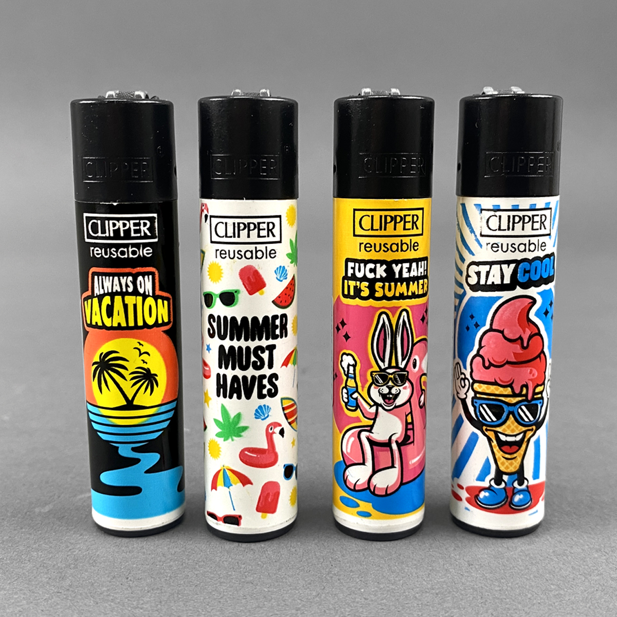 Die CLIPPER® Summer Feuerzeuge gibt es in vier einzigartigen und stylischen Motiven, die perfekt zu deinem lässigen Sommer-Look passen. Egal, ob du am Strand chillst, im Park mit Freunden abhängst oder einfach nur dein eigenes BBQ schmeißt – mit diesen Feuerzeugen bringst du frischen Wind in deine Sammlung!