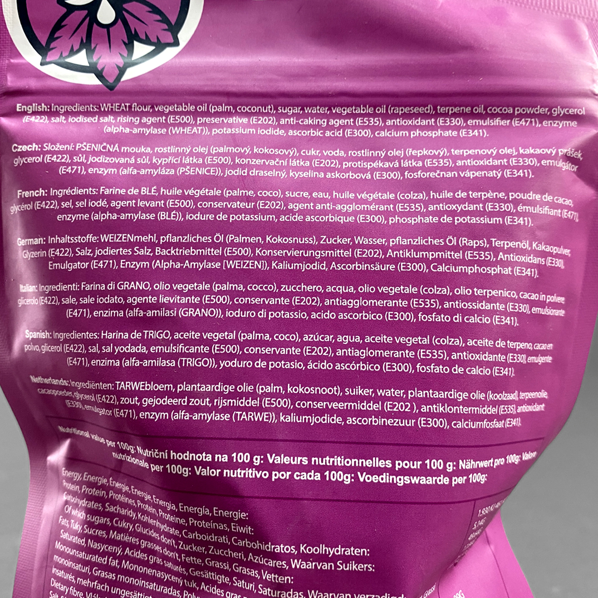 Inhaltsstoffe: WEIZENmehl, Pflanzenöl (Palm, Kokos), Zucker, Wasser, Pflanzenöl (Raps), Terpenöl, Kakaopulver, Glycerin (E422), Salz, Jodsalz, Backtriebmittel (E500), Konservierungsmittel (E202), Anti- Backmittel (E535), Antioxidationsmittel (E330), Emulgator (E471), Enzym (Alpha-Amylase (Weizen)), Kaliumiodid, Ascorbinsäure (E300), Calciumphosphat (E341)