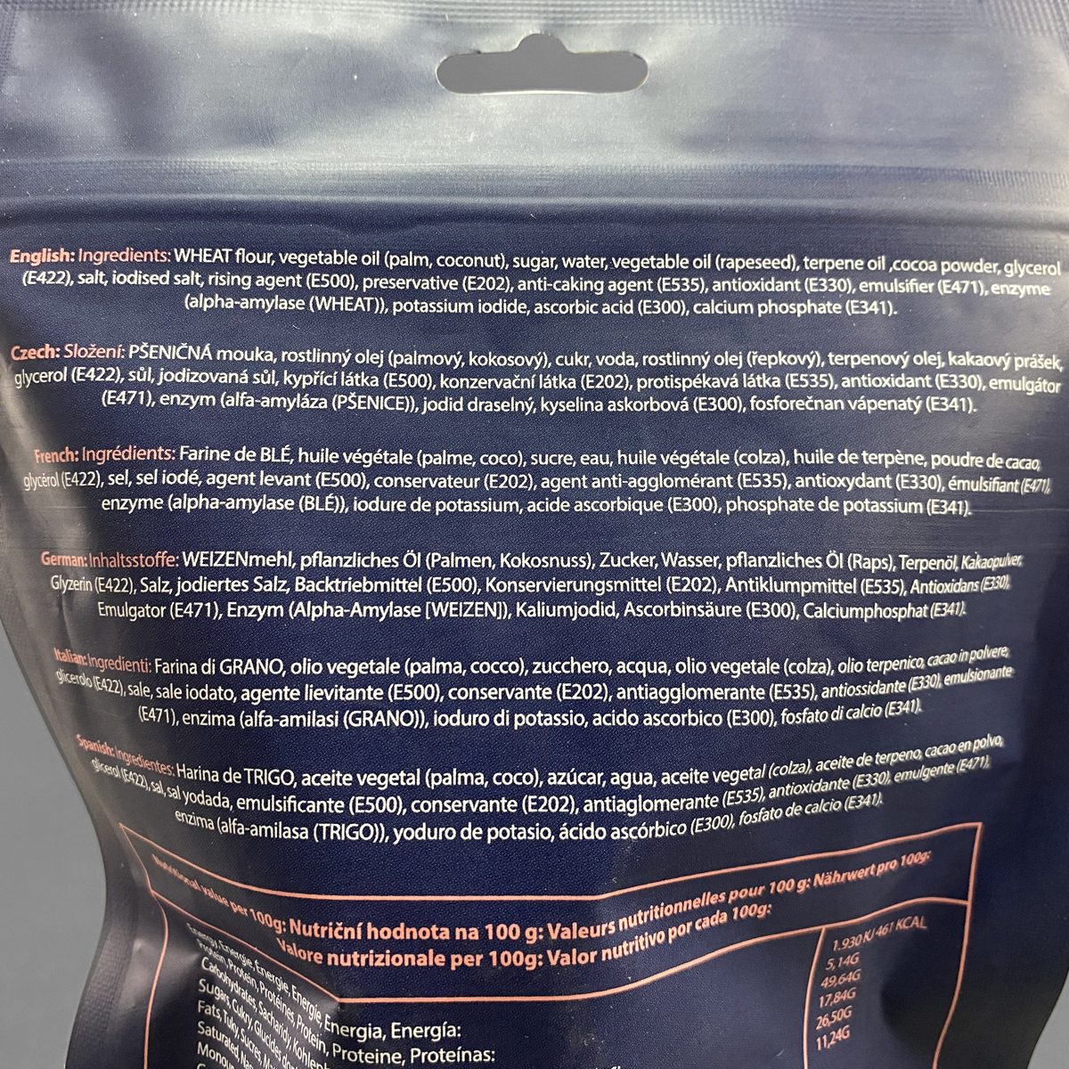 Inhaltsstoffe: WEIZENmehl, Pflanzenöl (Palm, Kokos), Zucker, Wasser, Pflanzenöl (Raps), Terpenöl, Kakaopulver, Glycerin (E422), Salz, Jodsalz, Backtriebmittel (E500), Konservierungsmittel (E202), Anti- Backmittel (E535), Antioxidationsmittel (E330), Emulgator (E471), Enzym (Alpha-Amylase (Weizen)), Kaliumiodid, Ascorbinsäure (E300), Calciumphosphat (E341)